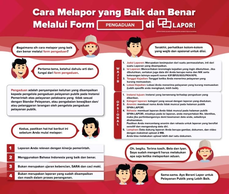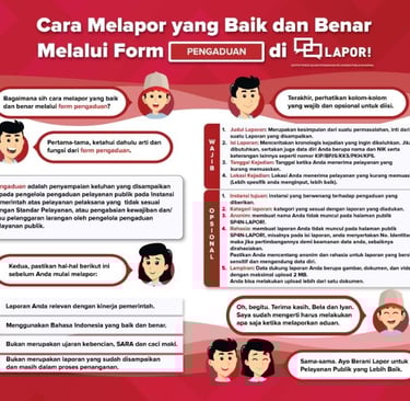 Pengaduan didefinisikan sebagai penyampaian keluhan yang ditujukan kepada pengelola pengaduan pelayanan publik pada Instansi Pemerintah atas pelayanan pelaksana yang tidak sesuai dengan Standar Pelayanan, atau pengabaian kewajiban dan/atau pelanggaran larangan oleh pengelola pengaduan pelayanan publik. Untuk membuat laporan yang baik dan benar, pelapor harus memenuhi beberapa persyaratan mendasar: relevan dengan kinerja pemerintah, menggunakan Bahasa Indonesia yang baik dan benar, bukan merupakan ujaran kebencian, SARA dan caci maki, serta bukan merupakan laporan yang sudah disampaikan dan masih dalam proses penanganan. Selain itu, pelapor perlu mengetahui arti dan fungsi dari form pengaduan itu sendiri. Kolom dalam form terbagi menjadi dua bagian: Wajib Diisi dan Opsional Diisi. Bagian Wajib Diisi meliputi Judul Laporan (kesimpulan inti), Isi Laporan (kronologis kejadian yang mungkin melibatkan data diri seperti NIK dan keterangan penting lainnya), dan Tanggal Kejadian/Tanggal Terima Pelayanan. Sementara itu, kolom Opsional Diisi mencakup Kategori Laporan, Tujuan Instansi yang berwenang, Lokasi Kejadian yang lebih spesifik, Nama Anda (yang bisa disembunyikan dari publik), Rahasia (untuk menjamin keamanan data), dan Lampiran dokumen, gambar, atau video pendukung dengan batas maksimal total 2 MB. Dengan memperhatikan seluruh petunjuk ini, masyarakat dapat berani melapor untuk terciptanya Pelayanan Publik yang Lebih Baik